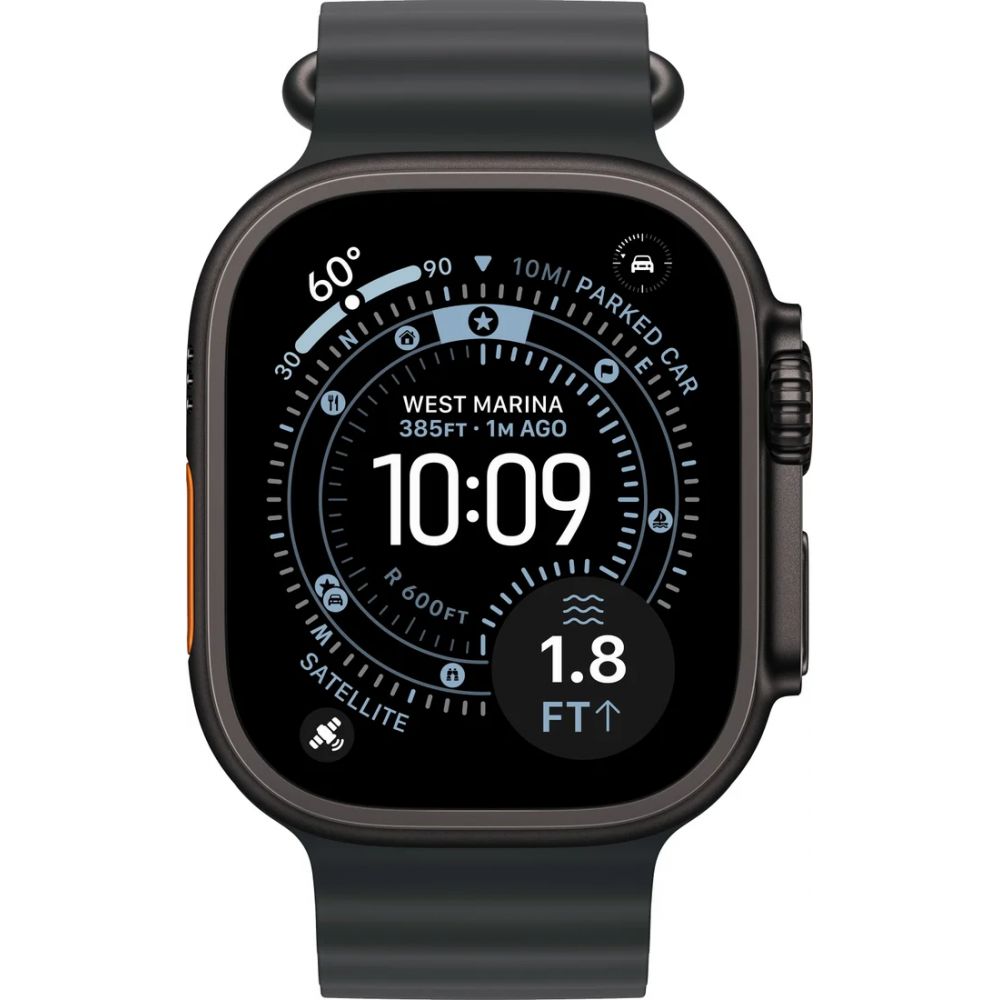 синхронизация с iOS, экран OLED 1.92", поддержка SIM-карты: eSIM, пульсометр, измерение кислорода в крови, измерение артериального давления, ЭКГ, AOD, GPS, Bluetooth 5.3, корпус: металл (титан), ремешок: силикон